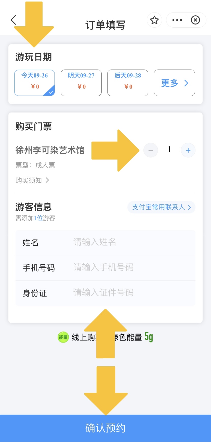 第四步:填写“游玩日期”、“门票数量”、“游客信息”,点击“确认预约”