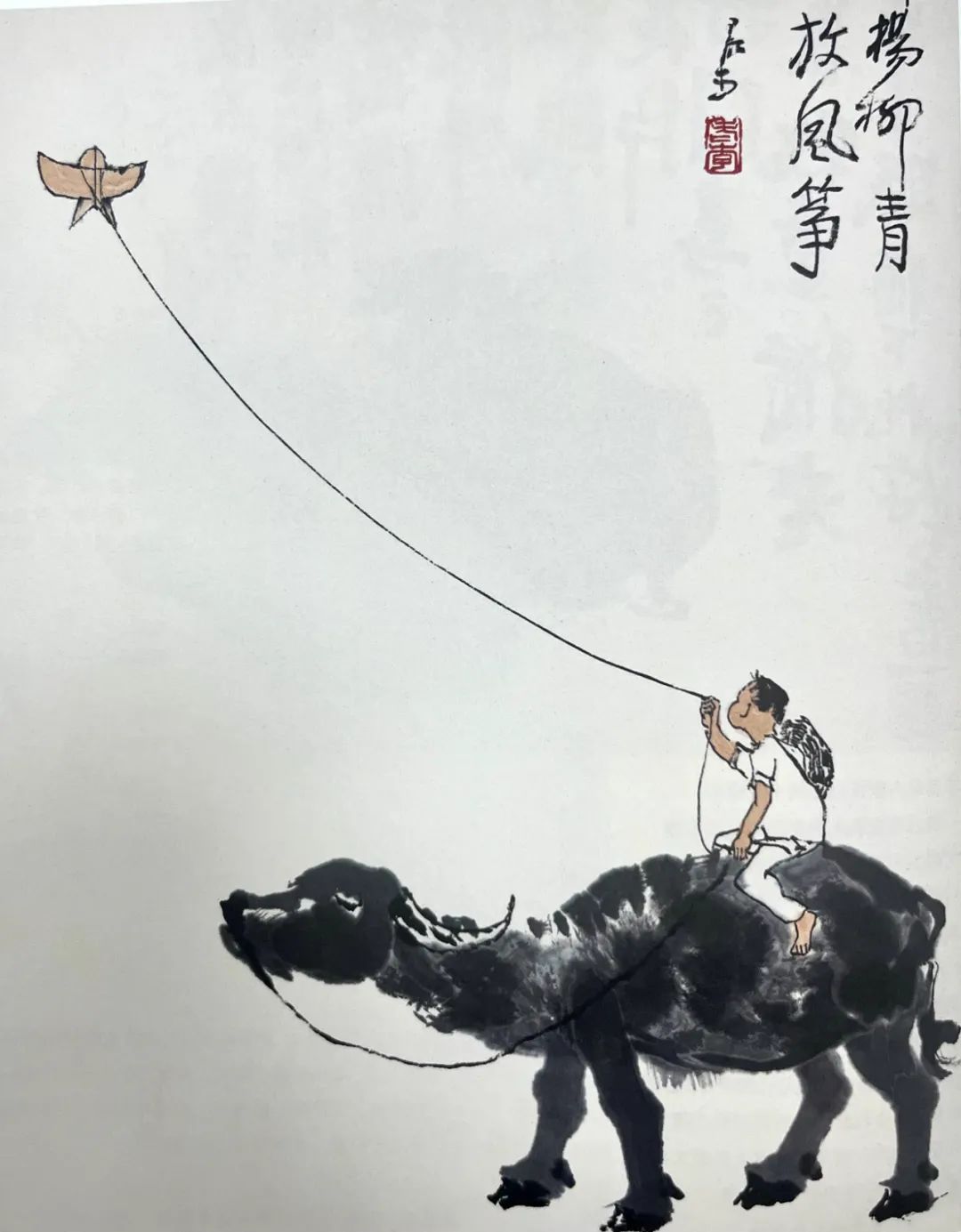 敦实憨厚、信步前行的老牛,灵巧稚拙、神情专注的牧童以及那只显然是自己糊制的简朴的风筝,是画面上仅仅几种可以直接看到的景物,其余为大量的空白,给人以空明疏朗的感受。借助于画上的题跋,人们记忆中的景象便浮现上来:宽阔广袤的田野,杨柳轻拂的小河岸边,青草漫漫的山坡……画家想要传达给观众的即是这么一种返璞归真、天人和谐的感受。